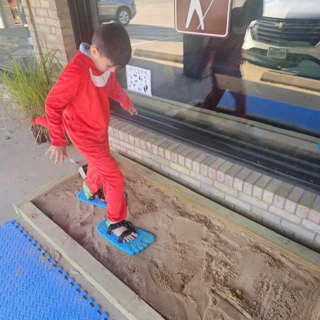 A variety of skills can be addressed with this activity. It is a great sensory activity with smoothing out the sand. Depending on goals we have a rake they can use to smooth sand or use their hands. Strengthening and grasp patterns can also be addressed with the Velcro straps on the big feet and on donning/doffing shoes. It is also a great coordination/motor planning activity!