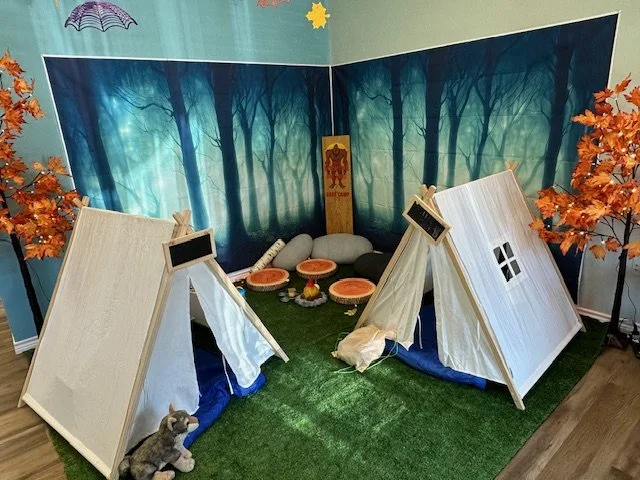 In our campsite we have the Astro Turf “grass” that has a scratchy feel. The boulders are weighted and provide heavy work when the kids have to move them. We encourage the kids to “set up” their campsite and arrange the boulders and logs where they want them to be. The logs and wood stumps are soft and squishy. The sleeping bags have s silky feel and we have the kids crawl in and our of them which gives them good proprioceptive input and works on body awareness. We also have the hard plastic of the fire, lanterns, and s’more utensils. With the boulders and logs, a great number of times, the children want to be on the floor with all of them piled on top of them. This is a good calming strategy for a child that might be getting overwhelmed. We have handouts about heavy work, what it means, ideas for activities, and how it is very useful for hyperactivity and emotional regulation located on our website.